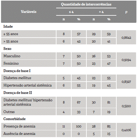 Os dados foram organizados e analisados com recursos da estatística descritiva (mínimo, máximo, desvio-padrão, média, frequência absoluta e relativa). Posteriormente, foi realizada a associação da quantidade de intercorrências com o sexo, a idade, as doenças de base e as comorbidades, por meio do Teste Qui-quadrado. Ressalta-se que, na associação das intercorrências com as doenças de base II, o termo "outras" representa todos os pacientes com doenças de base que não o diabetes mellitus ou a hipertensão arterial sistêmica. O programa BioEstat 5.3 foi utilizado para a aplicação dos recursos da estatística, com a adoção do nível de significância de p < 0,05.