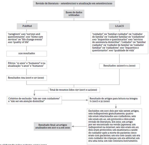 Excluídos: em 2017, dois por não serem artigos, sete indisponíveis gratuitamente, quatro não eram relacionados aos cuidadores, sete não eram em AD, um protocolo e dois eram revisão de literatura. Em 2020, um artigo por ser encontrado na versão japonesa; um indisponível na internet; seis não eram em AD; dois eram protocolos; um examinava a saúde do cuidador após a morte do paciente; cinco eram com pacientes; um era com casais; um era com cuidador de crianças; um era editorial; um era uma nota; um não constava instrumento.
