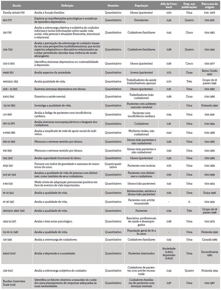 No Quadro 2, apresenta-se a caracterização das 28 escalas validadas para uso no Brasil 76-102. Em 11, o foco foram os aspectos relativos à saúde mental 77,80,81,83,84,87,89,93,97,100; em sete, os níveis de QV 82,85,92,94-96,98; em cinco, a sobrecarga 78,79,99,101,102; em duas, as funções de apoio tanto familiar 78 quanto social 88; em uma, o sono 91; em uma, a fadiga 86; em outra, a capacidade funcional 90. O alfa de Cronbach não foi identificado em apenas três instrumentos 85,95,98. Da totalidade, 19 foram elaborados nos Estados Unidos 76-80,83,84,86-93,95,97,102 e 21 foram elaborados nas décadas de 1980 e 1990: dez nos anos 1980 78,83,84,88-91,99,100,102) e 11 nos anos 1990 79,82,85-87,92-96,98.