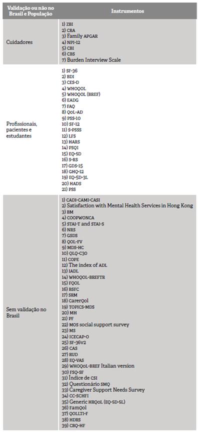 Legenda: CADI-CAMI-CASI: Carers Assessment of Difficulties Index-Carers Assessment of Managing Index-Carers Assessment of Satisfactions Index; CODAS: Communication Disorders, Audiology and Swallowing; WHOQOL: The World Health Organization Quality of Life; WHOQOL-BREF: The World Health Organization Quality of Life Bref; HARS: Hamilton Anxiety Rating Scale; BDI: Beck Depression Inventory; SF-36: Short-Form 36; ZBI: Zarit Burden Inteview; CBS: Caregiver Burden Scale; BM: The Pines Burnout Measure; EADG: Escala de Goldberg; COOP/WONCA: Darmouth Primary Care Cooperative Information Project/ World Organization of National Colleges, Academies, and Academic Associations of General Practitioners/Family Physicians; CES-D: The Center for Epidemiologic Studies Depression Scale; STAI-T and STAI-S: The Spielberger State Trait Anxiety Inventory; NRS: Descriptive Numeric Rating Scale; GSDS: The General Sleep Disturbance Scale; LFS: Lee Fatigue Scale; QOL-FV: The Quality of Life Scale-Family Version; CRA: Caregiver Reaction Assessment; MDS-HC: Minimum Data Set-Home Care; QLQ-C30: Quality of Life Questionnaire; PSS: Perceived Stress Scale; S-PSSS: Perceived Social Support Scale; S-RS: The Resilience Scale; PSQI: Pittsburgh Sleep Quality Index; EQ-5D: Health-Related Quality of Life; COPE: Carers of Older People in Europe; QOL-AD: Quality of Life-Alzheimer Disease scale; GDS-15: Geriatric Depression Scale - 15 items; Index of ADL: The index of activity of daily living; IADL: Lawton Instrumental Activities of Daily Living scale; WHOQOL-BREFTR: World Health Organization Quality of Life-Short Form, Turkish Version; FQOL: Family Quality of Life; BSFC: Short form of the Burden Scale for Family Caregivers; SRM: Social Relations Model; carerQol: Care-Related Quality of Life Instrument; TOPICS-MDS: The Older Persons and Informal Caregivers Minimum DataSet; MH: Health Survey Mental Health; PF: Physical Functioning; MOS social support survey: Caregivers social support (Medical Outcomes Study); SF-12: short-form-12; Family APGAR: adaptation, partnership, growth, affection, resolve Family questionnaire; MS: The Mutuality Scale; PSS-IO: Perceived Stress Scale 10; NPI-12: Neuropsychiatric Inventory; ICECAP-O: Index of Capability; FAQ: Functional Activities Questionnaire; SF-36V2: Short-Form 36 volume 2; CAS: Caregiver Appraisal Scale; GHQ-12: General Health Questionnaire; RUD: Resource Utilization in Dementia; EQ-5D-3L: three-level EuroQol five-dimensional questionnaire; EQ-VAS: EuroQol-Visual Analogue Scale; WHOQOL-BREF Italian version: The World Health Organization Quality of Life Bref Italian Version; HDRS: Hamilton Depression Rating Scale; FSQ-SF: Family Strain Questionnaire-Short Form; CSI: Robinson's Caregiver Strain Index; SMQ: Short-Memory Questionnaire; CBI: Caregiver Burden Inventory; HADS: Hospital Anxiety and Depression Scale; generic HRQOL (EQ-5D-5L questionnaire): health-related quality of life (five-level EuroQol five-dimensional); FamQol: Family Caregiver Quality of Life; CBQ-HF: Caregiver Burden Questionnaire for Heart Failure; CC-SCHFI: Caregiver's Contribution to Selfcare of Heart Failure Index; QOLLTI-F: Quality of Life in Life-Threatening Illness-Family Caregiver. Fonte: elaborado pelas autoras, 2020.