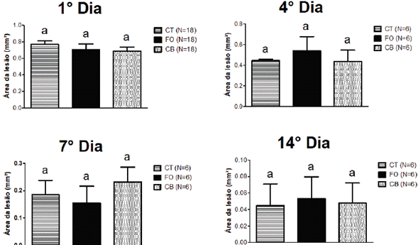No statistically significant differences were found between the experimental groups regarding the comparison of means of lesion area and fibroblast proliferation.