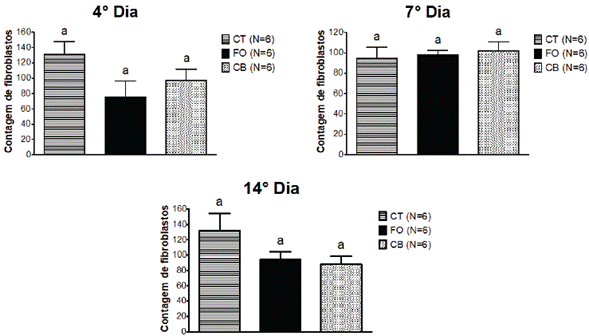 A contagem de fibroblastos realizada no 4o, T e 14o dia após a lesão e início do tratamento não revelou diferenças estatísticas significativas entre os grupos experimentais (Gráfico 2 e Figura 2).