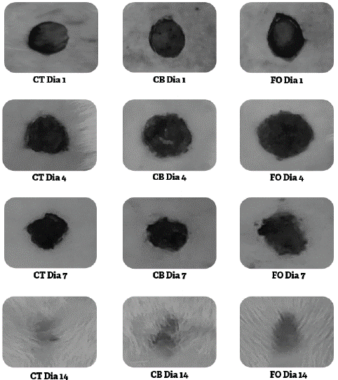 A cada 24 horas, a área da lesão de todos os animais era higienizada com água e sabão e, na sequência, os tratamentos eram oferecidos conforme o grupo experimental. Uma seringa de 1 mL (100 UI) foi utilizada para dosar os tratamentos oferecidos e, com o auxílio de uma espátula, o creme era sobreposto na lesão. Os tratamentos foram realizados sempre entre as 8h e as 10h. No 4°, 7° e 14° dia, seis animais de cada grupo foram anestesiados com sobredose anestésica, e espécimes da área de lesão foram coletados e armazenados em formalina a 10 % até o processamento histológico.