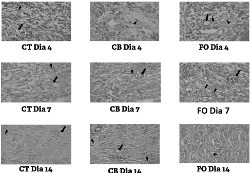 Os espécimes coletados no 4°, 7° e 14° dia foram incluídos em parafina, sendo obtidos cortes histológicos de 5 µm, os quais foram depositados em lâminas e corados com hematoxilina-eosina para a observação morfológica e a quantificação de fibroblastos 19,20. As lâminas histológicas foram analisadas em um microscópico óptico com aumento de 400x e as imagens capturadas por uma camera digital Moticam 2000 ® de 2.0 pixels acoplada ao microscópio. Para a quantificação dos fibroblastos, foram analisados seis campos de cada corte histológico de cada espécime do animal, sendo, ao fim, calculada a média desses valores.