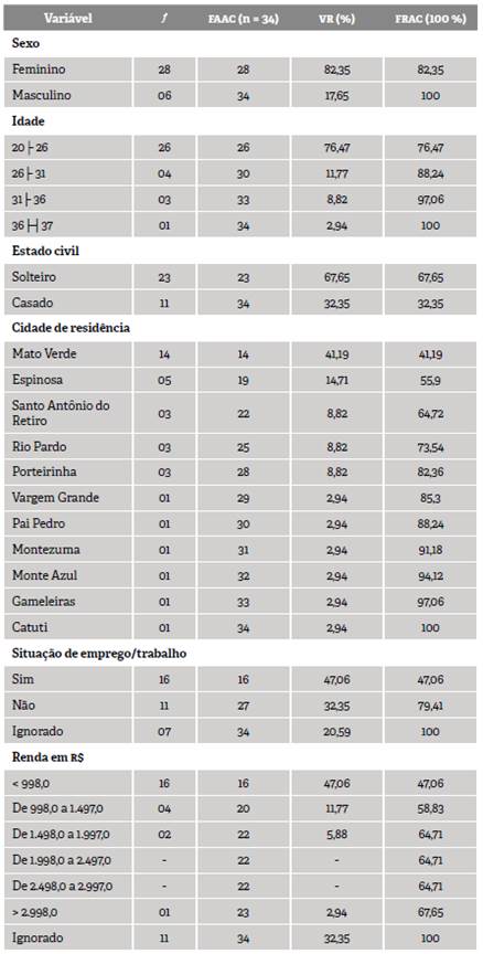 Participaram do estudo o total de N = 34 graduandos em Enfermagem de uma instituição de ensino superior privada do norte de Minas Gerais, Brasil, que representam 19,32 % dos acadêmicos matriculados no curso. A Tabela 1 mostra as variáveis socioeconômicas e demográficas consideradas neste estudo.