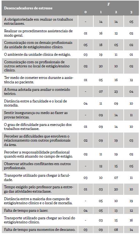 No Quadro 1, as situações que apareceram com maior frequência no Escore 3 como muito estres-santes para os acadêmicos foram: distância entre a maioria dos campos de estágio/ensino clínico e o local de moradia do académico (n = 19); o transporte utilizado para chegar ao local do estágio/ensino clínico (n = 16); a falta de tempo para momentos de descanso (n = 14) e o transporte utilizado para chegar à faculdade (n = 11).