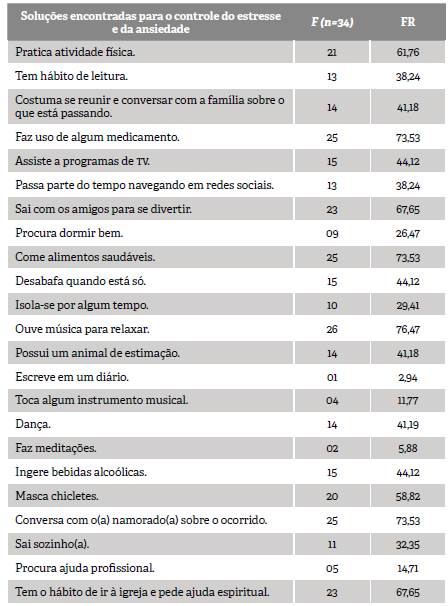 O Quadro 2 apresenta as estratégias de como os acadêmicos enfrentam o estresse. As principais estratégias citadas foram: ouvir música para relaxar (n = 26), consumir medicamentos, ingerir alimentos saudáveis e conversar com o(a) namo-rado(a), ambos com 25 ocorrências, ao passo que as estratégias menos adotadas citadas foram: escrever diário (n = 1), fazer meditação (n = 2), tocar instrumento musical (n = 4) e procurar ajuda profissional (n = 5).