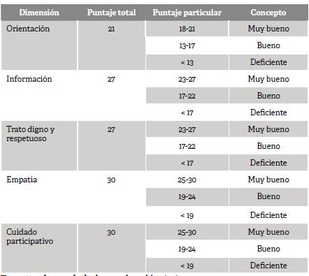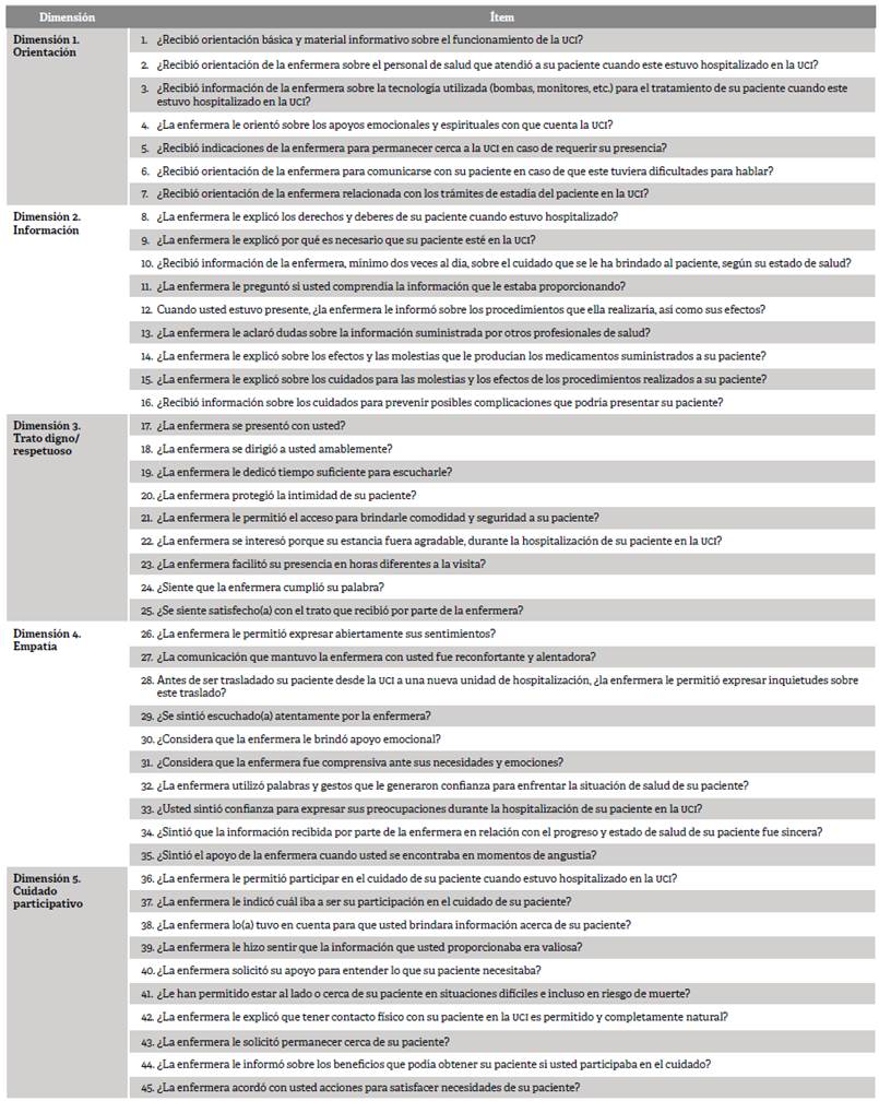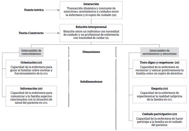 El instrumento está estructurado en cinco dimensiones (orientación, información, trato digno, empatía y cuidado participativo) (Cuadro 1) y fue el resultado de una revisión y crítica de 157 artículos de investigación que abordaron aspectos relacionados con la comunicación entre la enfermera y familia en la UCI; lo que hizo posible identificar y jerarquizar conceptos que permitían la operacionalización del constructo de relaciones interpersonales en una red nomológica (Figura 1) 17,18.