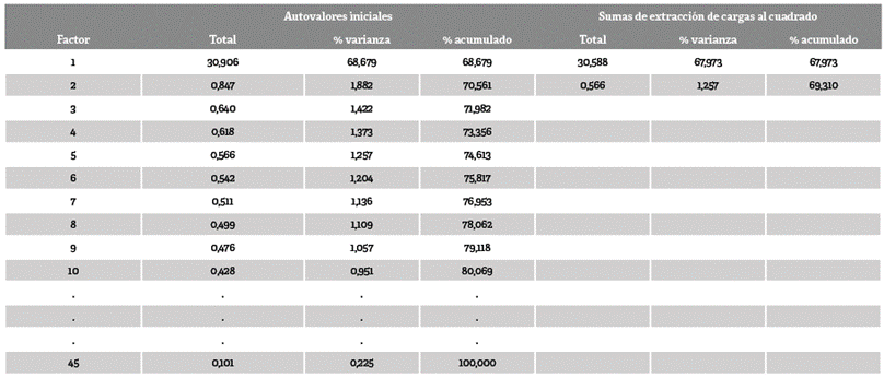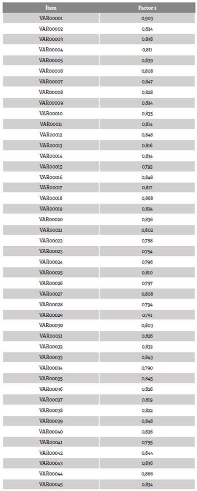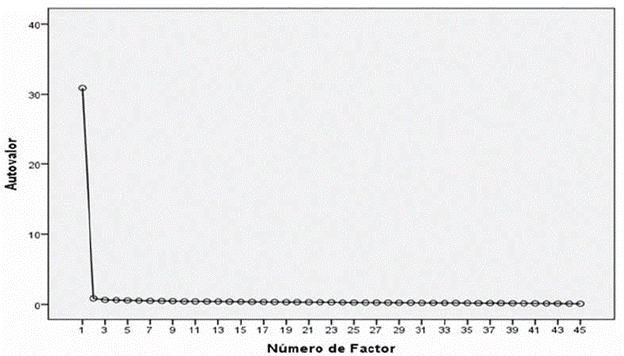 Inicialmente, se realizó un análisis a través de la técnica Kaisser Meyer Olkin (KMO = 0,989), la cual evidenció una buena adecuación muestral, indicando que los ítems evalúan factores comunes. El análisis factorial exploratorio determinó que el instrumento es estadísticamente unidimensional, ya que se extrae un factor (factor 1) con una carga factorial de 30,9 que explica el 68,6 % de la varianza total (Tablas 2 y 3; Figura 2), aspecto que contrasta con las dimensiones propuestas por las autoras del instrumento desde el punto de vista estadístico.