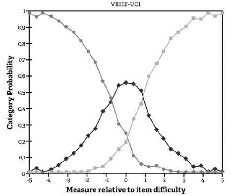 The VRIEF-UCI showed a global concordance index of 0.96; construct validity determined that the instrument is one-dimensional with an explained variance of 68.6% for one factor; criterion validity evidenced a correlation index with the external criterion of 0.876; the reliability of the instrument is determined with a reliability index by halves of 0.90. The Rasch model showed adequate levels of difficulty, which translates into a high probability that participants adequately develop the instrument (mean square residuals of 0.99 and standardized statistical fit of -0.1 for internal fit, and mean square residuals of 1.01 and standardized statistical fit of 0.1 for external fit).