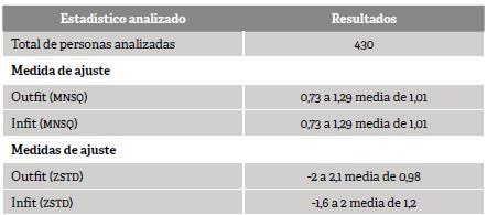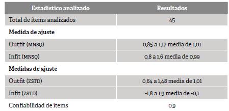 Los ajustes al modelo de Rasch de cada uno de los ítems, y en general de todo el instrumento, se encontraron dentro de los límites aceptables (Tablas 4 y 5). Lo anterior se traduce en una muy buena probabilidad de que cada uno de los ítems sea desarrollado adecuadamente por los sujetos de investigación.