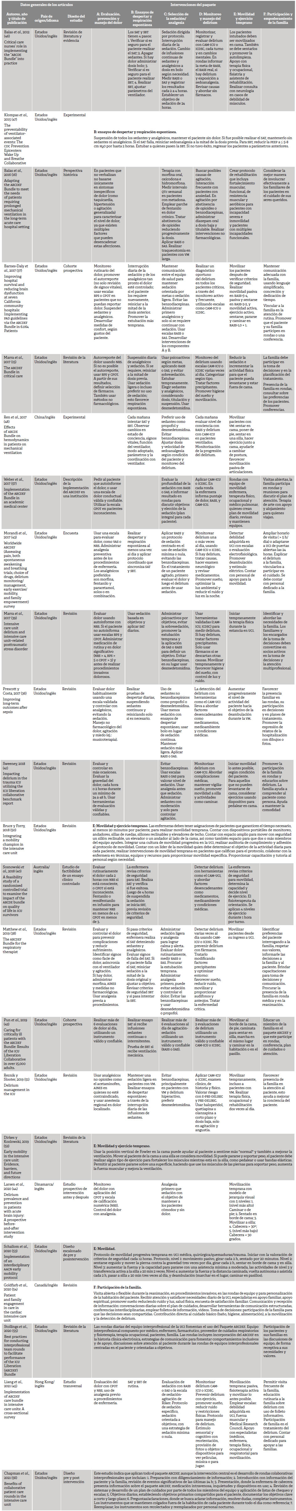 Las principales intervenciones del componente A se enfocaron en la valoración frecuente del dolor con el uso de escalas validadas (VAS y NRS para pacientes conscientes y CPOT y BPS para pacientes críticos que no pueden comunicarse), así como en su control a través de medidas no farmacológicas, de confort y con algunos analgésicos cuando sea necesario (iniciando por acetaminofén, morfina y AINES). En el componente B es oportuna la interrupción diaria de la sedación y los analgésicos, previa verificación de criterios de seguridad, para realizar despertar diario y evaluar la posibilidad de alcanzar una respiración espontánea que permita la extubación temprana. El componente C sugiere iniciar con la valoración frecuente del estado de sedación con la aplicación de las escalas RASS o SAS, además del uso de sedación guiada por metas, o de sedación ligera, de forma intermitente, o el no uso de esta, dando enfoque central en la analgesia, desde el cual puede no requerirse la sedación. En el componente D se encontró la constante monitoría del delirium con el uso de escalas validadas como CAM-ICU o ICDSC, junto con la identificación y modificación oportuna de factores precipitantes del delirium. En el E, se recomendó la implementación de un protocolo y de un equipo para la movilización temprana, donde se dispongan ejercicios y equipos específicos, según las condiciones de los pacientes, iniciando con terapia física, con movilización de cama a silla, sostenerse en pie y corta deambulación. Finalmente, en el componente F las intervenciones se centraron en vincular a la familia en la toma de decisiones, la planificación del tratamiento, la rutina del cuidado y en las rondas médicas.