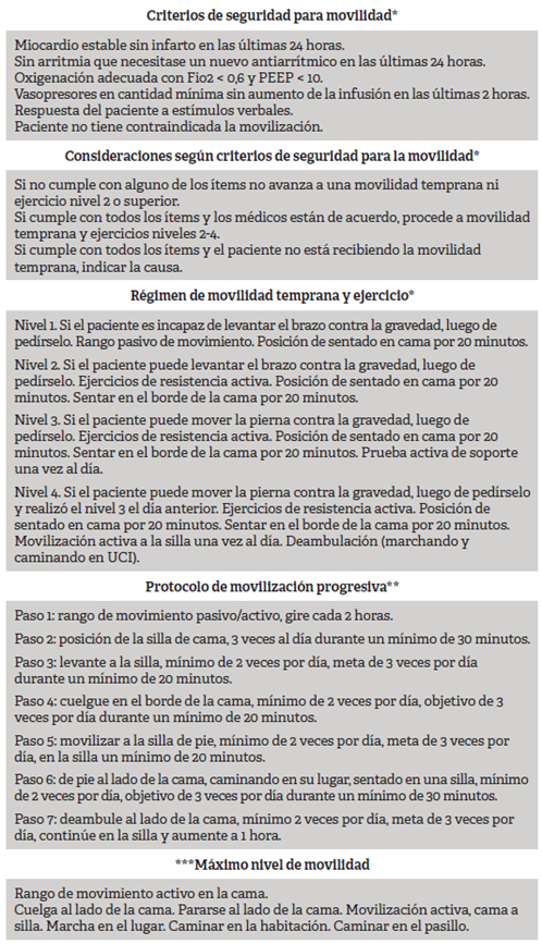 Así mismo, previo al inicio de la movilidad, deben verificarse criterios de seguridad 37,40,53, capacidad de ejercicio y además desarrollar un plan de movilidad diario 40,53,57. El Cuadro 3 presenta ejemplos de estos. En general, la evidencia recomienda la movilidad en todos los pacientes de UCI intubados o no, involucrando actividades físicas como sentarse, pararse, caminar y entrenamiento 15,36,37,42,43,50,52.