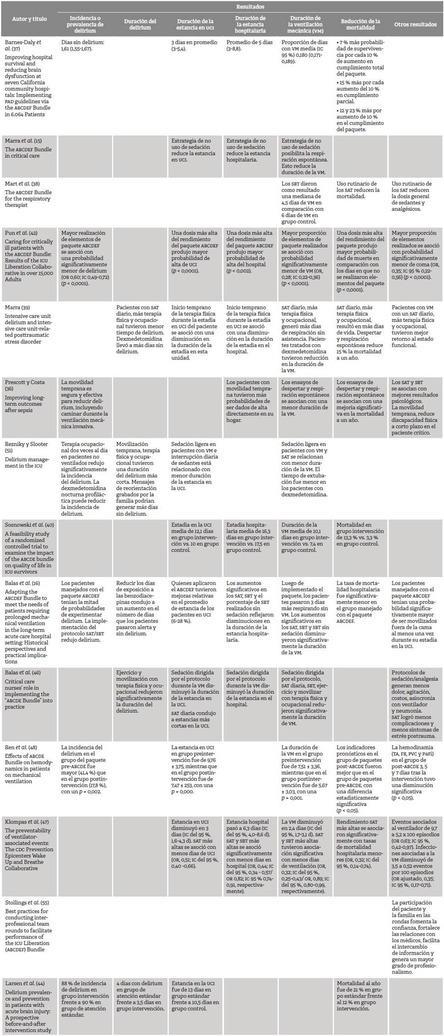 Las intervenciones del paquete ABCDEF, específicamente los componentes B, C y E, mostraron ser efectivas para prevenir el delirium, reducir su duración, el tiempo de estancia en uci y en hospitalización, así como para reducir los días de ventilación mecánica y la mortalidad.