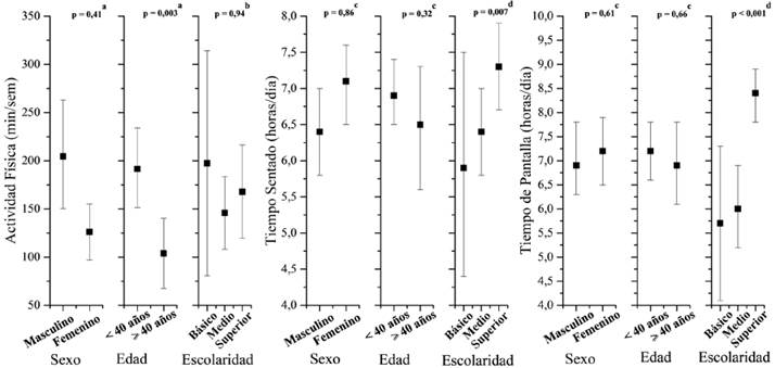 Las personas mayores tienen menos tiempo para realizar AF en comparación con las más jóvenes, así como mayores probabilidades de permanecer inactivas. Los individuos considerados activos presentaron el mismo TS que los inactivos. Con respecto al comportamiento sedentario, se observa que las personas con educación superior tienen medias más altas de TS y tiempo frente a las pantallas. Además, aquellos que pasan más de 2 horas/día frente a la pantalla tienen más probabilidades de permanecer sentados durante períodos más largos.