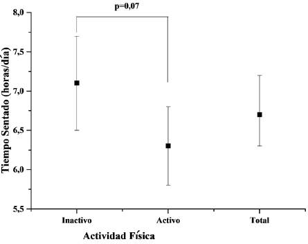 Figura 2: Medias y desviación estándar del tiempo sentado en horas/día según actividad física. Estudio AvaliaSal, Vitória-ES, 2019