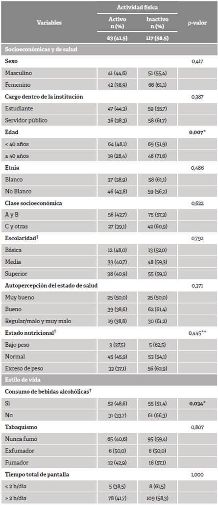 Al comparar las variables sociodemográficas, de salud y de estilo de vida entre los sujetos activos y los inactivos, se evidenció una diferencia estadística para el grupo de edad y el consumo de alcohol, señalando que la mayor parte de individuos inactivos estaba en el grupo de edad superior a 40 años y no consumían bebidas alcohólicas (Tabla 1).