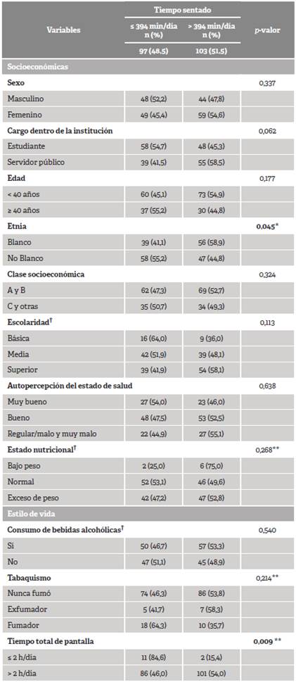 El tiempo de permanencia sentado (TS) fue evaluado utilizando 2 preguntas del dominio de tiempo sentado del cuestionario IPAQ, con el fin de identificar cuántas horas por día, durante la semana y durante el fin de semana un individuo permaneció en dicha posición 18. Esta variable se calculó multiplicando el TS en días hábiles y fines de semana. Con la suma de estos valores se realizó la división por siete (correspondiente a los días de la semana), totalizando el promedio de horas/día de TS. Para la clasificación de los grupos se usó la mediana, correspondiente a 394 min/día.