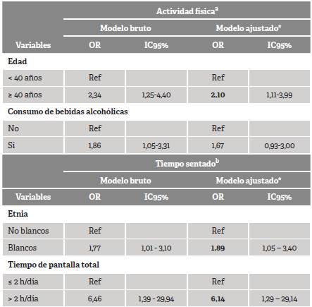Ref: categoría de referencia; a Referencia: activos; b Referencia: ≤ 394 min/día. *las variables fueron ajustadas entre sí. Fuente: elaboración propia con datos del estudio.
