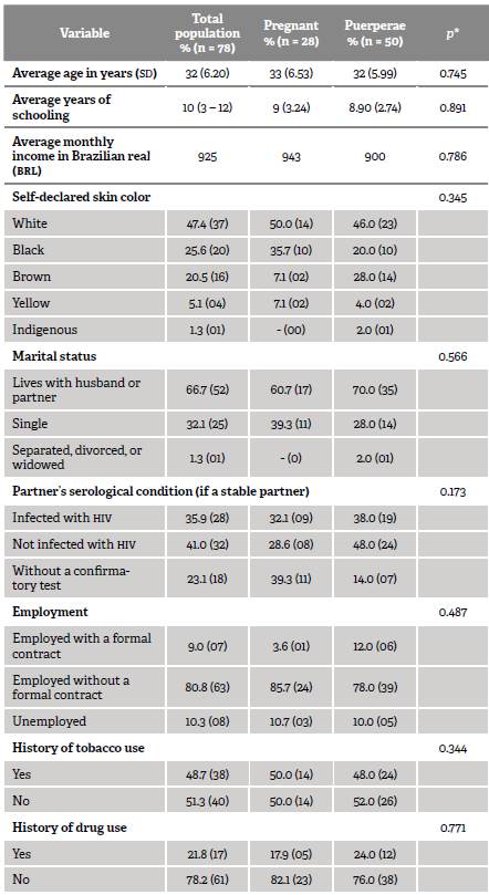 The average age of the participants was 43.21 years old (SD = 10-47 years old), median of 10 years of schooling (minimum of 3 years; maximum of 12 years), and median monthly income of BRL 925 (minimum of BRL 134; maximum of BRL 3,000). With respect to the self-declared skin color, 47.4 % (n = 37) identified themselves as white, 25.6 % (n = 20) as black, 20.5 % (n = 16) as brown, 5.1 % (n = 4) as yellow, and 13 % (n = 1) as indigenous. Out of the 78 participants, 64.1 % (n = 50) were in puerperium at the time of data collection (Table 1).