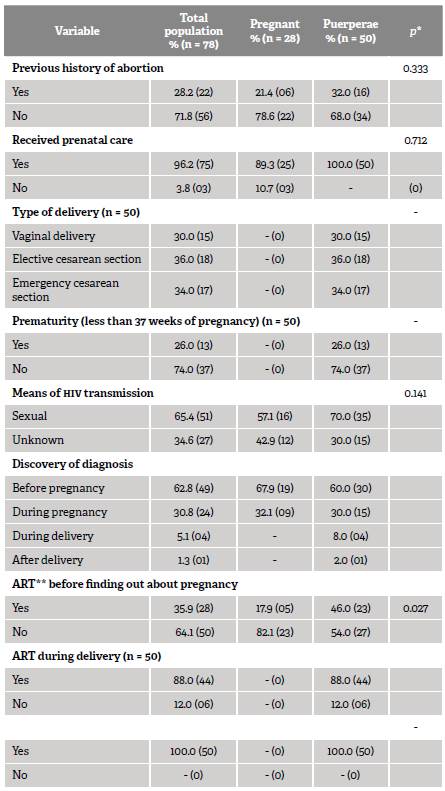 * Fisher's exact test. **Anti-retroviral Therapy (ART) ***Only among those with HIV diagnosis before pregnancy. Source: authors with research data.