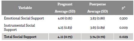 The population of pregnant and puerperal women presented an arithmetic average of social support of 3.79 points (SD = 0.79). The arithmetic average for the scale dimensions was 3.86 points (SD = 0.86) for emotional social support and 3.73 points (SD = 0.90) for instrumental social support. The assessment of the distribution of social support among pregnant and puerperal women showed a significant difference in total social support and instrumental social support, demonstrating that the group of pregnant women had higher rates of social support compared with the group of puerperal women (Table 3).