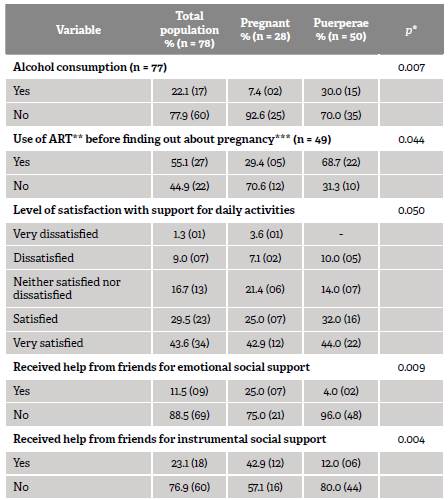 The variables with a significant result among pregnant and puerperal women with HIV show that alcohol consumption and the use of ART before finding out about the pregnancy was higher in puerperal women. This group also reported dissatisfaction with the support received for daily activities, which is perceived in the lack of support from their friends in both emotional and instrumental social supports, especially when compared with the period of pregnancy (Table 4).