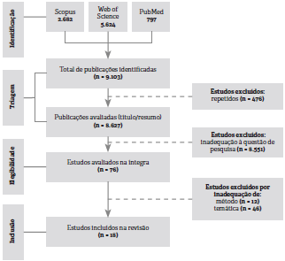 A chave de busca empregada foi: Coronavirus infections OR Coronavirus OR SARS vírus OR Covid-19 AND mental health. Essa chave foi adaptada para as bases de dados eletrônicas, conforme as particularidades operacionais de cada uma em específico. Estabeleceram-se como critérios de inclusão os artigos originais, publicados em qualquer idioma e sem limite temporal que respondessem à questão de pesquisa. Excluíram-se os artigos do tipo comments e revisão de literatura sem metanálise.