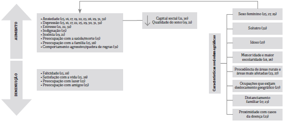 revisão integrativa da literatura conduzida nas bases de dados eletrônicas Web of Science, Scopus e MEDLiNE/PubMed. Evidenciou-se a ampliação de sentimentos relacionados à ansiedade e à depressão, à redução da qualidade do sono e às preocupações com a vida, a saúde, a morte e a família, ao passo que se observou a redução da satisfação com a vida, da felicidade e do interesse por lazer e encontros.