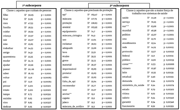 No dendograma (Figura 1), que deve ser lido da esquerda para a direita, a classe 1, denominada "aqueles que cuidam de pessoas", registrou 229 ST, 45,1 % dos 508 ST totais. A classe 2, "aqueles que precisam de proteção", apresentou 69 ST, 13,5 % do total. Já a classe 3, "aqueles que são a maior força de trabalho nos sistemas de saúde", corresponde a 210 ST, com 41,3 % do total. Para a inclusão dos termos ativos nas classes, foram utilizados o qui-quadrado > 3,88 e a significância estatística p < 0,05.