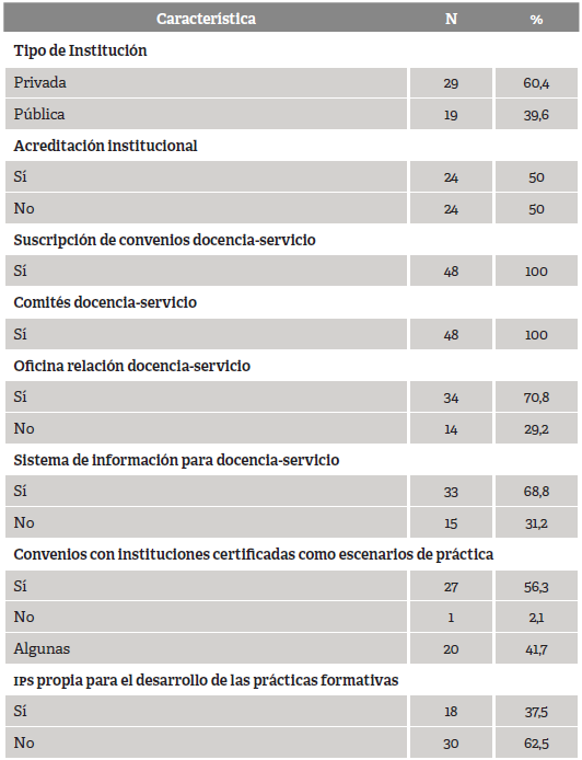 De las 48 IES participantes, 60,4 % es de carácter privado y 39,6 % de naturaleza pública. El 50 % de estas no contaba con acreditación institucional al momento de la realización de la encuesta. Además, el 70,8 % de las IES contaba con una oficina de relación docencia-servicio. Se resalta que la profesión de base de la persona encargada de liderar este proceso en las instituciones era Enfermería y que 39,6 % de estos profesionales contaba con especialidad o maestría. Así mismo, 68,8 % de los programas contaban con un sistema de información que les permitía hacer registro y seguimiento a la relación docencia-servicio (Tabla 1).
