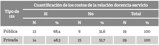 Con relación a las IES que cuantifican (en pesos colombianos) el costo de los convenios, se encontró que 68,4 % de las 19 IES públicas con programas de pregrado de enfermería tienen cuantificados los costos de la relación docencia-servicio, mientras que de las 29 IES privadas, 51,7 % presenta esta misma característica. Según los datos obtenidos, el costo mínimo anual de la relación docencia-servicio para programas de enfermería fue COP 24.000.000 y el mayor pago encontrado por la contraprestación fue de COP 2.398.539.070 (Tabla 3).