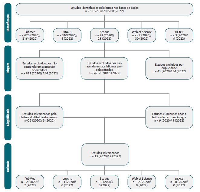 Após 1 ano e 4 meses da primeira análise e da caracterização dos artigos, a atualização dos dados foi necessária. Com isso, realizou-se uma nova busca, em janeiro de 2022, com as mesmas estratégias utilizadas anteriormente. Nessa procura, 288 artigos foram identificados e importados para o Rayyan®, sendo 34 excluídos por estarem duplicados. Após a leitura dos títulos e dos resumos, os avaliadores consideraram que 246 artigos não respondiam à questão orientadora do estudo e que outros cinco não correspondiam aos idiomas pré-selecionados, totalizando a exclusão de 251 artigos e a inclusão de três artigos. Após ler os três artigos em sua totalidade, os avaliadores consideraram que um artigo não abordava cuidados de enfermagem e, por isso, foi excluído. Dessa forma, a amostra final da busca do ano de 2022 incluiu dois artigos. Portanto, a amostra total de artigos selecionados foi de 15, considerando a somatória dos artigos selecionados em 2020 e 2022 (Figura 1).