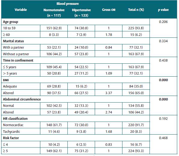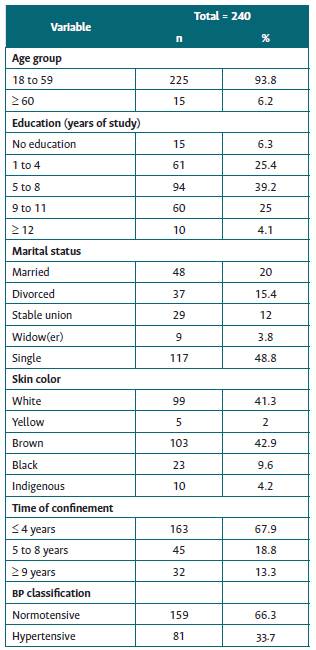 A total of 240 inmates participated in the study. Participants had a mean of 37.17 years (SD 11.5 years), most of them had attended school for five to eight years (39.2%), were single (48.8%), had been in prison for less than four years (67.9%), and were brown (42.9%) and white (41.3%). Most participants were normotensive at the time of data collection (66.3%) (Table 1).