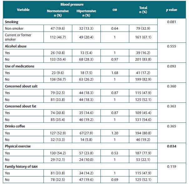 Regarding careful food intake and possible lack of control of BP, the concern with salt and fat consumption showed no association with hypertension (p = 0.360 for concern with salt consumption and p = 0.363 with fat consumption). No correlation was identified between coffee drinking and SAH (p = 0.365) (Table 2).
