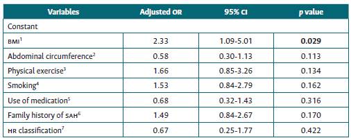 Univariate analysis allowed us to identify that physical exercise was negatively associated with the development of systemic arterial hypertension (p = 0.034). However, body mass index and abdominal circumference were positively associated with cardiovascular risk and systemic arterial hypertension (p = 0.000). Through multivariate analysis, we noted the statistical significance of the body mass index when controlled for all other variables in the model (adjusted OR = 2.33).