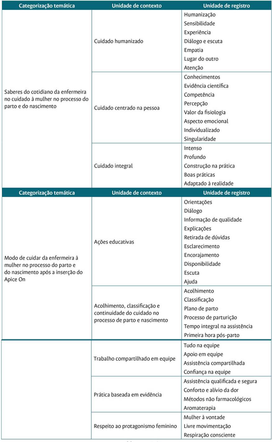 Adotou-se a técnica de colorimetria para identificar e agrupar unidades de registro e unidades de contexto, o que permitiu compreender o processo para a fundamentação das categorias temáticas: saberes do cotidiano da enfermeira no cuidado à mulher no processo do parto e do nascimento, e modo de cuidar da enfermeira à mulher no processo do parto e do nascimento após a inserção do Apice On, conforme pode ser observado na Tabela 1.
