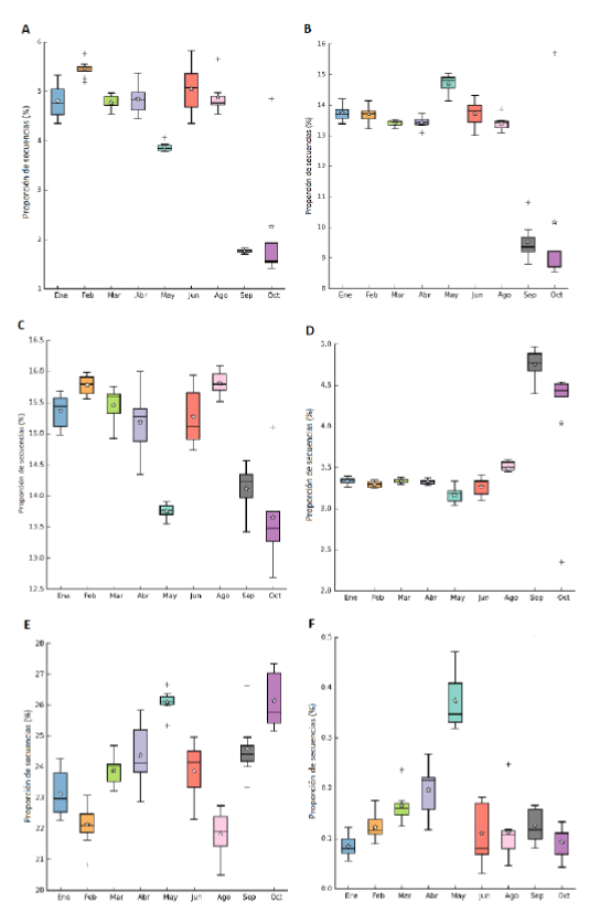 Figura 2: Patrones de variación mensual de la abundancia relativa de los números KO relacionados con las rutas de los ciclos del nitrógeno y azufre (proporción con respecto al total de números KO del metabolismo del nitrógeno y del azufre, respectivamente). A. Nitrificación. B. Desnitrificación. C. Reducción desasimilatoria del nitrato. D. Reducción asimilatoria del nitrato. E. Reducción asimilatoria del sulfato. F. Oxidación y reducción desasimilatoria del sulfato.