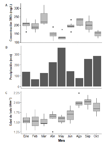 Figura 3: Comportamiento temporal de las variables ambientales y de operación de la planta estudiada A. Concentración de materia orgánica en el afluente (DBO5, mg-L-1) B, Precipitación acumulada (mm). C. Edad de lodo (días-1).