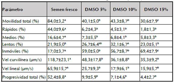 La progresividad total del semen descongelado osciló entre 9,9±5,9% (DMSO 5%) y 4,4±2,7% (DMSO 15%) sin observarse diferencia entre estos valores (p>0,05). La velocidad curvilínea del semen descongelado osciló entre 48,3±17,8 µm/s (DMSO 5%) y 35,3±9,2 µm/s (DMSO 15%) (p>0,05). Una tendencia similar fue observada en la velocidad lineal, la cual osciló 25,7±9,3 µm/s (DMSO 5%) y 15,9±5,7 µm/s (DMSO 15%) (tabla 2).