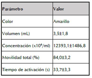 El color del semen de dorada estuvo en el rango de amarillo pardo a amarillo, con volumen seminal promedio de 3,5±1,8 ml y movilidad total previa al proceso de congelación mayor a 80%, de acuerdo a lo propuesto por Martínez et al. (2011) para Prochilodus magdalenae. El tiempo de activación osciló entre 28,5 y 41 s; mientras que la concentración espermática osciló entre 10188,1 y 14590,2 millones/ml (tabla 1).