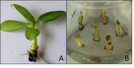 Figura 1: A: planta in vitro de Musa spp. seleccionada para los experimentos de estrés hídrico. B: brotes in vitro de Musa spp. en el momento de la siembra en medio de cultivo semisólido de multiplicación suplementado con PEG-6000.