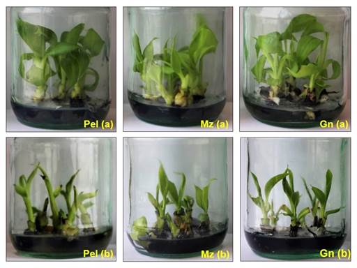 Figura 2: Plantas in vitro de diferentes cultivares de Musa spp. no sometidas a estrés (a) y sometidas a estrés hídrico (b) inducido con PEG-6000 a los 30 días de cultivo. Pel y Mz: cultivares de plátano ‘Pelipita’ (ABB) y ‘Manzano’ (AAB) respectivamente, Gn: cultivar de banano ‘Grande naine’ (AAA).