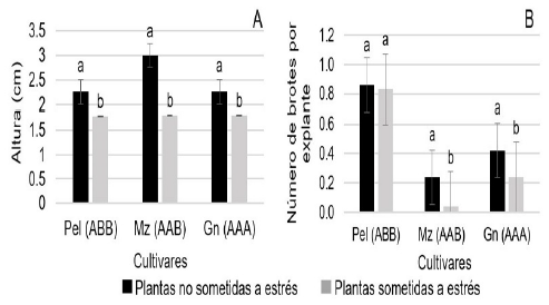 Una disminución en diferentes caracteres morfológicos de plantas de Musa spp. sometidas a estrés hídrico, también ha sido informada por otros autores, por ejemplo, Moreno-Bermúdez et al. (2014) en el cultivar ‘Grande naine’, Bidabadi et al. (2012) y Mahmood et al. (2012) en el cultivar ‘Berangan’ (AAA) sometido a estrés hídrico in vitro con PEG-6000. En cultivares de plátano con genotipo B, que como se mencionó con anterioridad se les atribuye una mejor tolerancia a la sequía, solo se han encontrado respuestas semejantes para las variables morfológicas aquí evaluadas, en condiciones ex vitro. Ejemplos de lo anterior son los estudios realizados por Ismail et al. (2004) en el cultivar ‘Pisang mas’ (ABB), y Surendar et al. (2013b) en los cultivares ‘Ney Poovan’ (AB), ‘Poovan’ (AAB), ‘Karpuravalli’ (ABB) y ‘Saba’ (ABB).