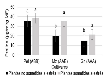 En Musa spp. la determinación del contenido de prolina ha sido útil para identificar plantas tolerantes al déficit hídrico (Mahmood et al., 2012; Sreedharan et al., 2013). En estos estudios se han relacionado los incrementos de este aminoácido con una tolerancia al estrés, contrario a lo observado en el presente trabajo. Sin embargo, el rol de la prolina ante un déficit hídrico es una cuestión controversial, ya que existen criterios diversos y no se ha llegado a un consenso en este sentido. (Reyes et al., 2012; Florido & Bao, 2014). Algunos autores asocian los incrementos con una tolerancia al estrés (Llano & Alcaraz, 2012; Lum et al., 2014) y otros con una sensibilidad (Lamz et al., 2013).