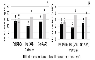 Aumentos en el contenido de H2O2 en plantas de Musa spp. sometidas a estrés hídrico in vitro han sido también observados por varios autores, por ejemplo, Shekhawat et al. (2011), en el cultivar de plátano y ‘Rasthali’ y Bidabadi et al. (2012) en banano cv. ‘Berangan’. En todos estos estudios, como en el presente, los incrementos en el contenido de H2O2 estuvieron acompañados de incrementos en los contenidos de MDA, y ambos se han relacionado con una sensibilidad de las plantas a la falta de agua.