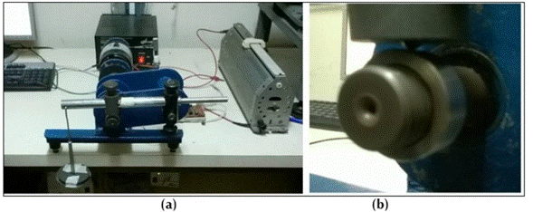 Figura 1: Tribómetro tipo bola sobre anillo (a) arreglo general del dispositivo (b) detalle de la geometría del contacto
