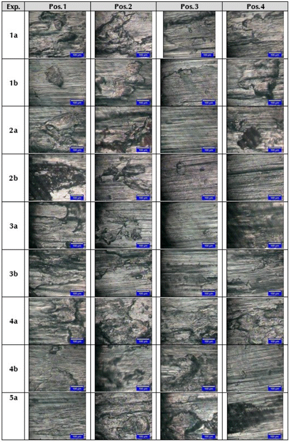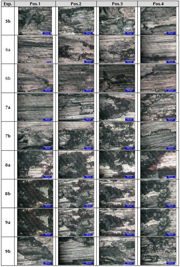 Las imágenes de las tablas 7 y 8, en general muestran una marca (huella) de deslizamiento con mucho daño superficial, indicando condiciones de desgaste de moderado a severo para las condiciones evaluadas. Este desempeño se corrobora con los valores obtenidos del coeficiente de desgaste, los cuales son mayores a 20 x 10-15 m2/N, que de acuerdo a Wang (Wang, Lei, & Liu, 1999) indica la transición para el desgaste de moderado a severo en aceros. Adicionalmente, el mecanismo de desgaste es de adhesión y de delaminación, puesto que el proceso dominante se destaca por la transferencia de material, deformación plástica, la formación de grietas y la generación de capa tribológicas y su desprendimiento durante el desplazamiento (Suh N. P., 1986), como lo evidencia, por ejemplo, las micrografías correspondientes a los experimentos 3, 4, 5, 7, 9. En particular, en la micrografía de la posición 2 del experimento 3a y 5a (ver tabla 7), , se puede apreciar agrietamiento y deformación plástica severa, estimándose un mecanismo de desgaste por delaminación a alta velocidad, que con el valor de coeficiente de desgaste de 0,254 a 0,333 x 1012 m2/N esta en concordancia con lo mostrado en los mapas de desgaste desarrollados por Ashby y Lim (Ashby & Lim, 1990).