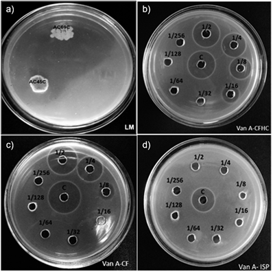 Figura 1:: a) Actividad antimicrobiana de los actinomicetos AC69C y AC45C frente a Listeria monocytogenes ATCC7644 (LM), mediante la técnica de la doble capa. Título de la actividad antimicrobiana de la cepa AC69C frente a ERV (fenotipo Van A) en: b) caldo de fermentación con hidratos de carbono (CFHC), c) caldo de fermentación sin hidratos de carbono (CF) y d) caldo ISP1 (International Streptomyces Proyect).