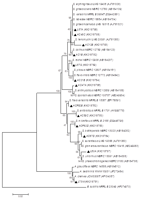 Figura 2: Árbol filogenético construido según el método estadístico Neighbor-joining basado en la relación entre las secuencias del gen ARNr 16S de cepas aisladas de actinomicetos (▲). Los números internos de nodos corresponden a los valores de soporte de bootstrap ((60 %). Entre paréntesis se muestran los números de acceso al GenBank. La secuencia de gen ARNr 16S de la cepa B.subtilis fue elegida arbitrariamente como secuencia externa al grupo. (Barra, 0,02 sustituciones por posición de nucleótidos).